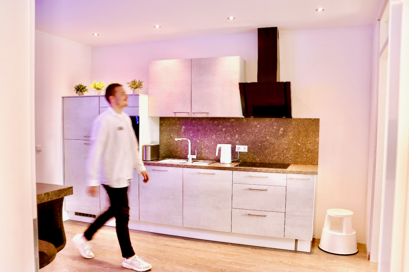 Dezente farbige Hue®-Lichtakzente verleihen den Räumen zusätzlich eine warme, lebendige Note.